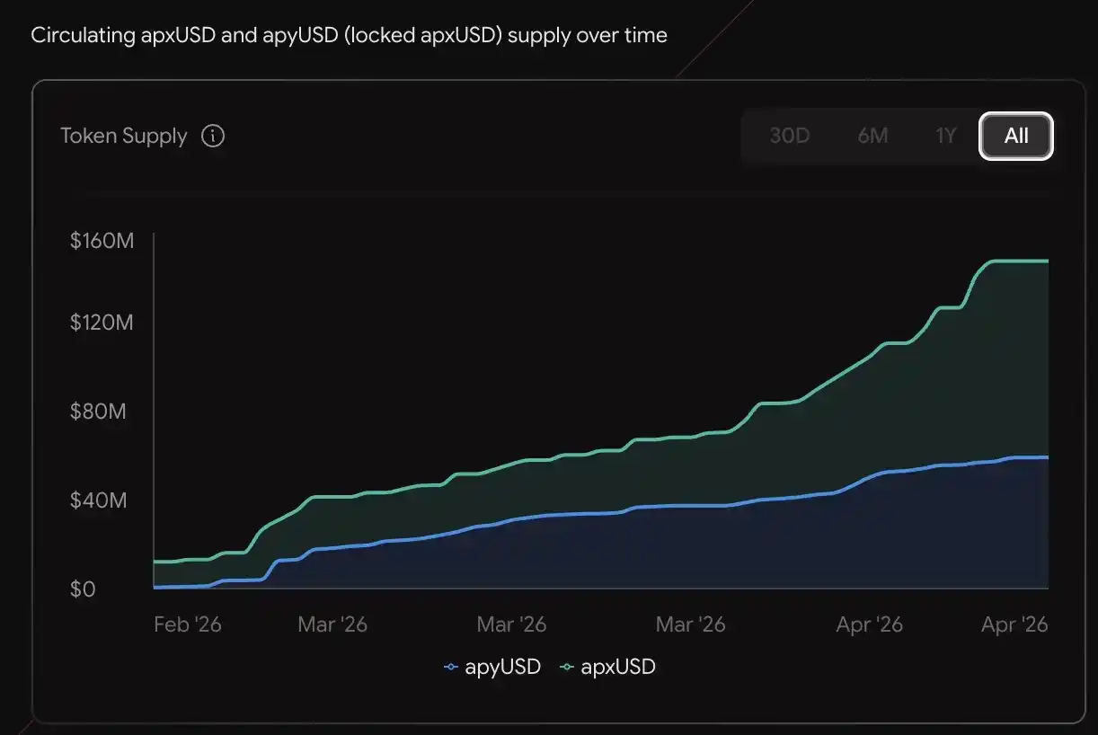 Apyx Protocol uses a dual-token model. apxUSD is the base stablecoin, over-collateralized by preferred stocks like STRC, SATA, and US Treasuries; apyUSD is the staked version, receiving the underlying dividend and interest income, currently with an APY of about 12.78%. The supply规模 has reached $130 million, and corresponding yield and leverage products are already available on Pendle and Morpho.