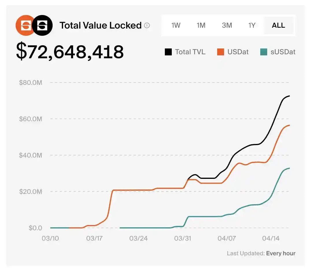 Saturn Credit's sUSDat is a staked, yield-bearing stablecoin that承接 STRC's yield. The protocol's TVL surged from zero to $72.6 million in just over a month.