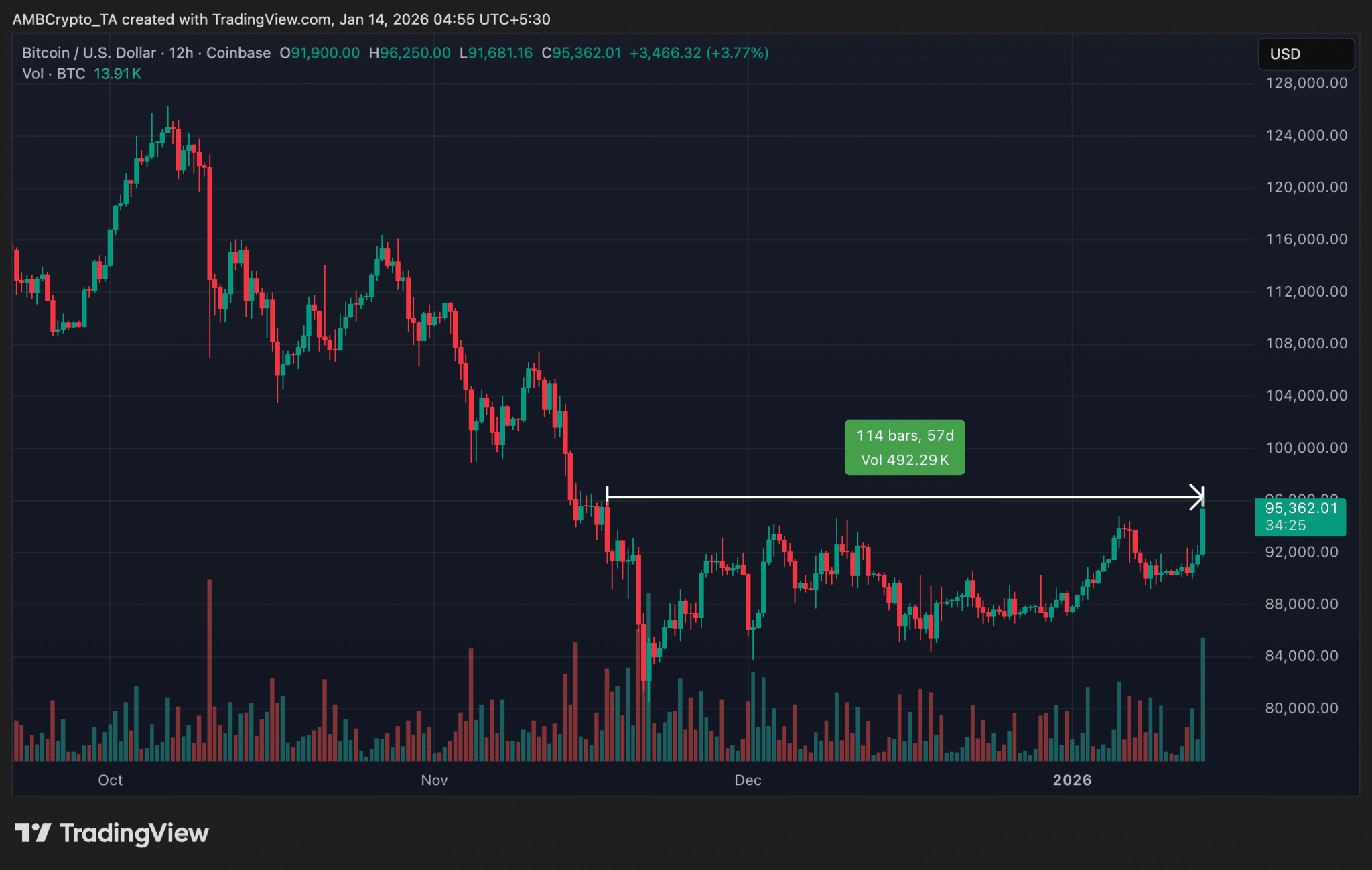 The price structure also supports this interpretation. After bottoming near $84,000 in late November, Bitcoin began forming higher lows throughout December and early January, even as it failed to break higher.