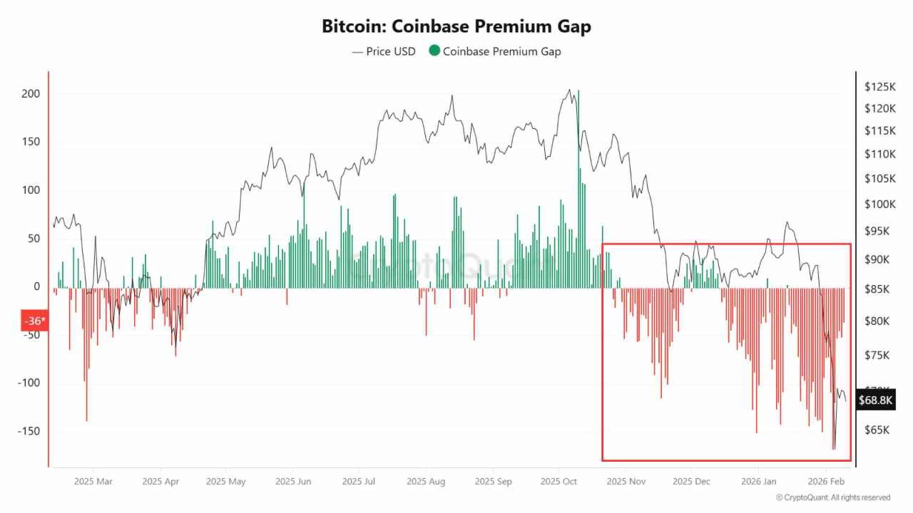 Dalam lingkungan ini, Bitcoin tetap rentan terhadap pergerakan risk-off jangka pendek, sering berperilaku mirip dengan ekuitas ketika likuiditas mengencang. Meskipun ekspektasi pelonggaran moneter akhir dapat memicu rally, keberlanjutan rebound tersebut tetap tidak pasti. Patut dicatat, Coinbase Premium Gap tetap bertahan negatif sejak akhir 2025, mengindikasikan permintaan spot AS yang lemah dan pergerakan harga yang didorong largely oleh derivatif.