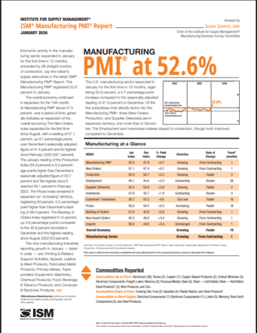Según el Institute for Supply Management, el PMI se situó en 52,6 para enero. Esa cifra cruza la línea que separa la contracción del crecimiento.