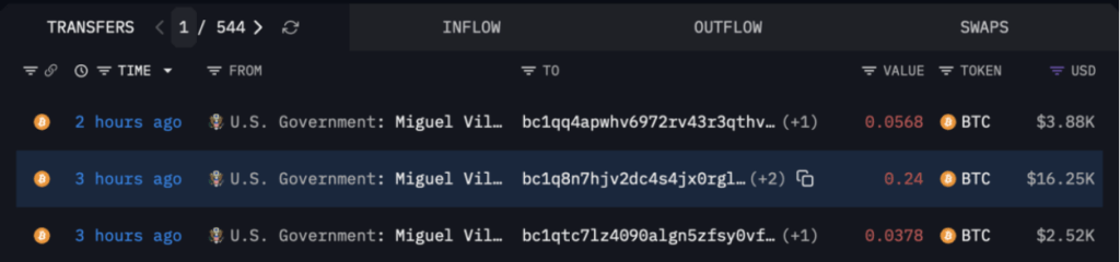 On-chain analytics platform Arkham Intelligence tracked three transfers totaling roughly 1.23 Bitcoin — about $22,550 — from a wallet labeled “Miguel Villanueva Seized Funds” to three separate wallets, receiving $2,500, $16,250, and $3,800 respectively.