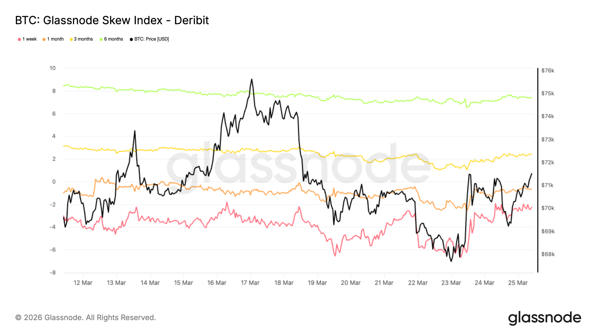 为期权图景添加另一层,偏斜指数与25 delta偏斜相比提供更细微信号。由于加权于低delta期权,它反映了整个分布翼部的定价。1周期和1月期读数仍处于看跌区域,而3月期和6月期数值(约2.4%和7.4%)转入看涨区域,因为指数计算为看涨期权减去看跌期权。