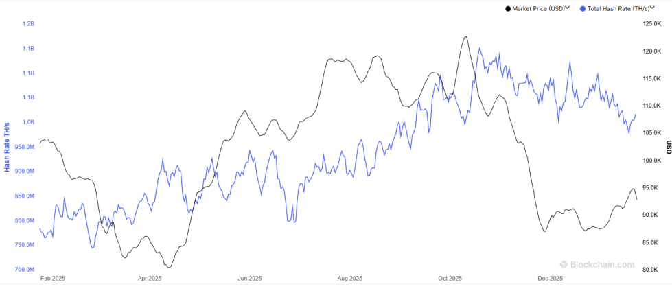 The trend in the 7-day average value of the BTC Hashrate during the past year | Source: Blockchain.com
