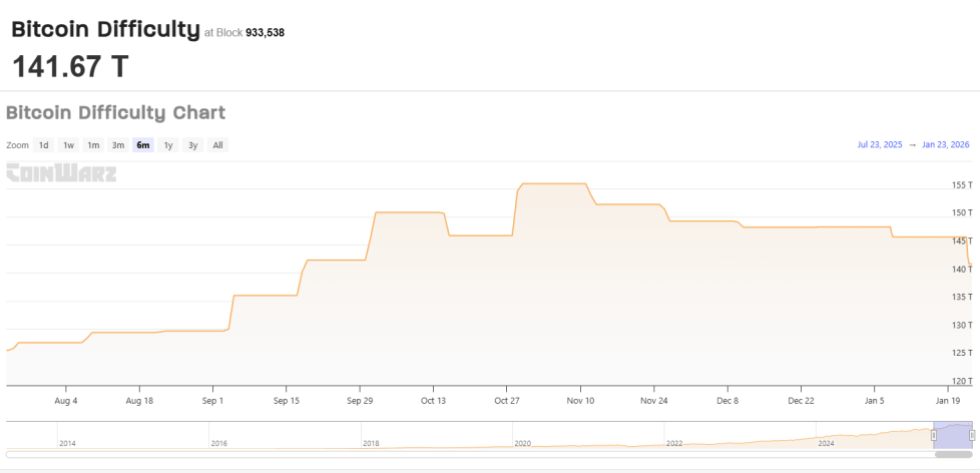 Prior to the change, the indicator had a value of 146.47 trillion hashes. Now, it has dropped to 141.67 trillion hashes, indicating a decrease of 3.28%. This is the second-consecutive reduction in the network Difficulty.