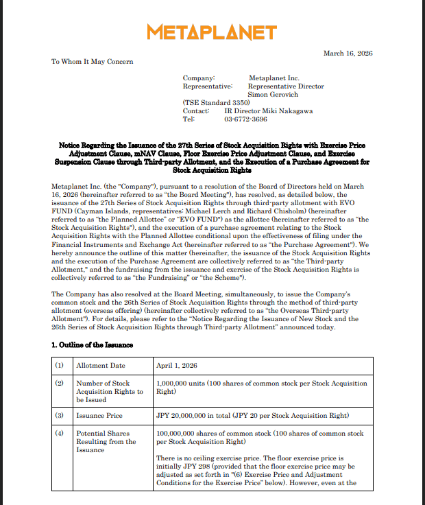 Metaplanet đã huy động được ~255 triệu đô la từ các nhà đầu tư tổ chức toàn cầu thông qua một đợt phát hành cổ phiếu mới với giá định giá cao hơn 2%, kết hợp với chứng quyền giá cố định ở mức cao hơn 10% nhằm kiếm lời từ biến động vốn cổ phần của chúng tôi để có thêm tới ~276 triệu đô la vốn bổ sung khi thực hiện. Tổng cộng lên tới ~531 triệu đô la... pic.twitter.com/0tg62TopGR