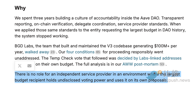 This is the second major contributor to leave within two weeks—previously, on February 20th, the development team behind the Aave V3 codebase, BGD Labs, announced its departure.