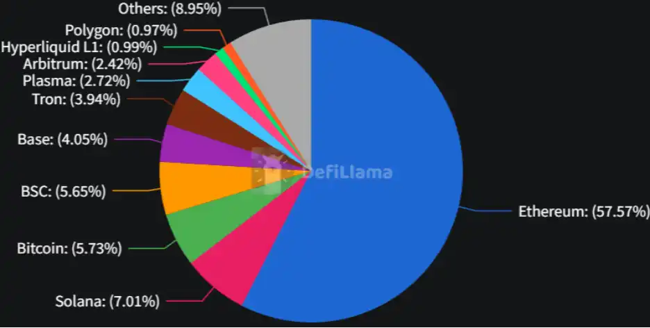 If TVL is Ethereum's "muscle," then stablecoins are its "blood." As of January 22, Ethereum's market share in the stablecoin领域 has reached about 58%. Against the backdrop of growing global on-chain demand for dollars, Ethereum, as the primary launchpad for stablecoins, has built a deep liquidity moat for its ecosystem.