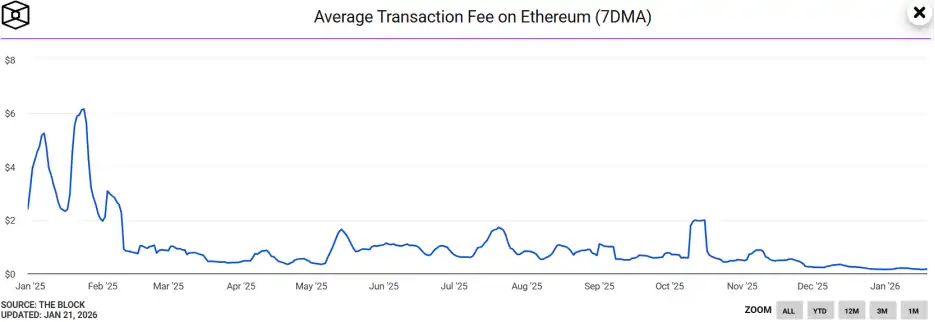 Simultaneously, Ethereum's 7-day moving average Gas fee dropped to a historical low below 0.03 Gwei, with the cost of a single transfer being only about $0.15.