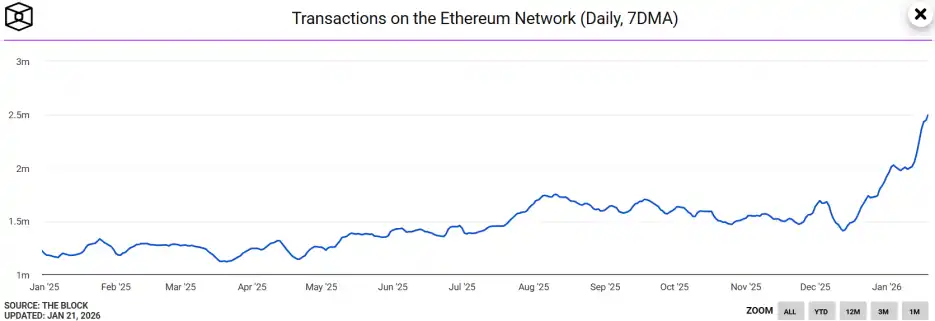 Recently, Ethereum staged a counterintuitive spectacle: its 7-day moving average number of transactions reached 2.49 million, hitting a new historical high, more than double the same period last year.