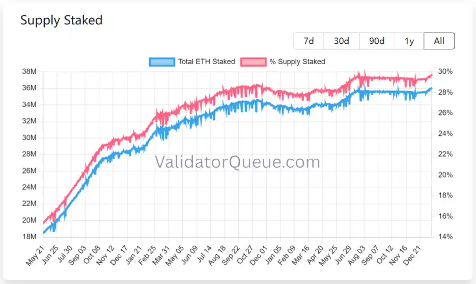 According to ValidatorQueue data, as of January 22, 2026, Ethereum's staking scale reached a historical high of nearly $1.2 trillion, with over 36 million ETH staked, accounting for about 30% of the circulating supply.