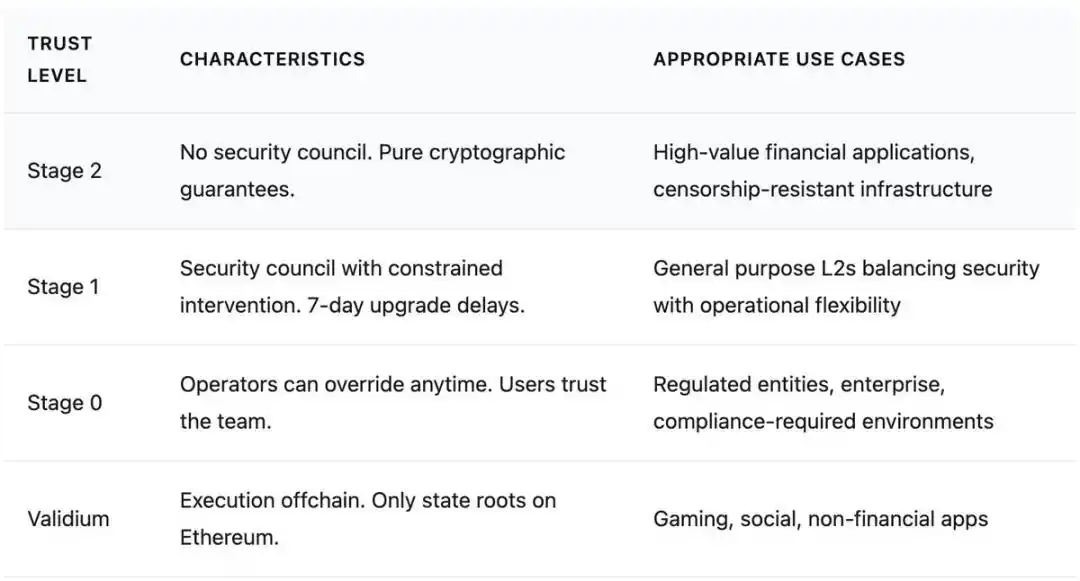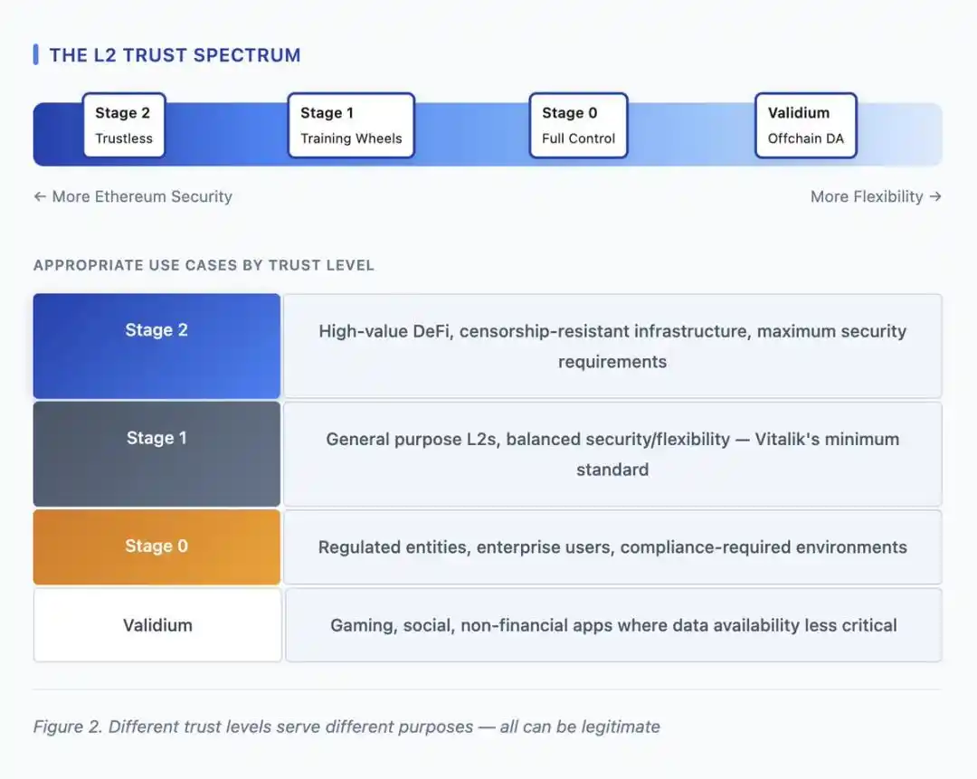 Vitalik's most core conceptual contribution is liberating L2s from the framework of a "single category, uniform obligations" and redefining them as "diverse entities existing on a trust spectrum." The previous metaphor of "branded shards"默认 all L2s needed to pursue Stage 2 decentralization and, as extensions of Ethereum, bear the same value and security commitments as L1. The new framework acknowledges: different L2s have different purposes, and for projects with specific needs, Stage 0 or Stage 1 decentralization can be a perfectly reasonable end goal.
