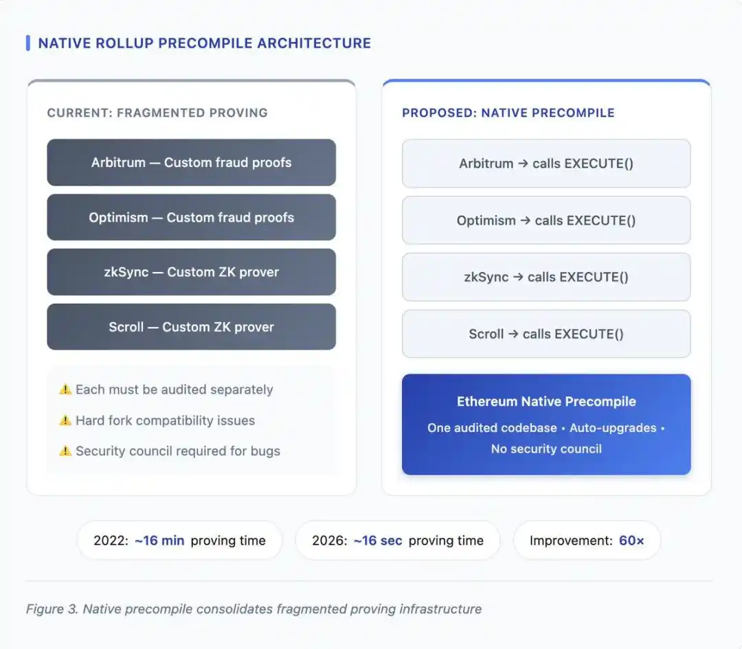The "Native Rollup Precompile" involves building a function for "verifying EVM execution" directly into Ethereum. Then, each L2 would no longer need to maintain custom provers, but only need to call this shared infrastructure. The advantages are significant: only 1 codebase needs auditing (instead of dozens), automatic compatibility with Ethereum upgrades, and once the precompile functionality is battle-tested, it might even allow for the removal of security councils.