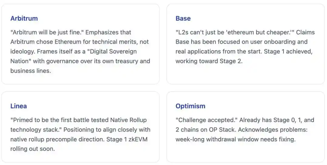 AThe responses showed healthy strategic diversity: Arbitrum emphasized independence and self-sufficiency, Base focused on applications and users, Linea closely aligned with the native Rollup direction, and Optimism acknowledged current challenges while committing to ongoing improvements. This diversity indicates the success of the 'trust spectrum' framework, allowing different teams to pursue different strategic positions for their respective markets without pretending to move toward the same endpoint.