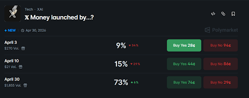 在Polymarket预测市场上,目前仅有15%的几率X Money会在4月10日前推出,而有73%的几率在4月30日前推出。市场评论员马里奥·纳法尔表示,此举将推动埃隆·马斯克的X平台扩展至支付、银行和加密货币领域,目标是打造全能型「万能应用」。
