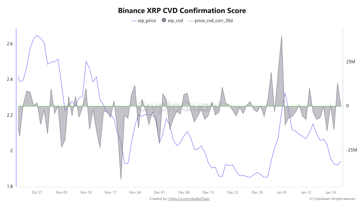 A report from Arab Chain adds an important layer of context by focusing on Binance flow dynamics. According to the report, data from Binance’s XRP platform shows the 30-day correlation between price and CVD (Cumulative Volume Delta) sitting near 0.61, which signals a moderate to strong positive relationship between price action and net volume flows. In simple terms, XRP’s recent moves have not been disconnected from trading activity.