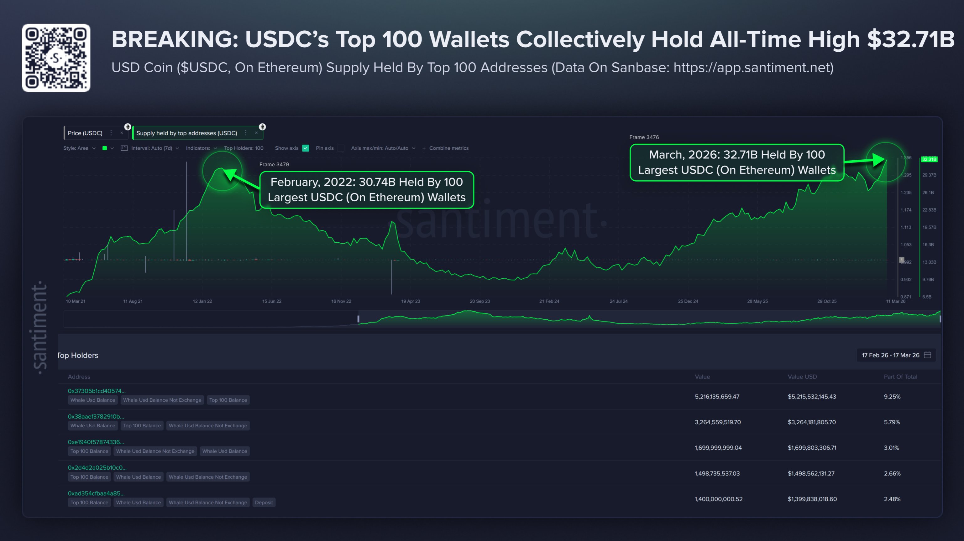 Trong một số tin tức khác, 100 địa chỉ USDC hàng đầu trên mạng Ethereum hiện nay nắm giữ khoảng 32,71 tỷ token của stablecoin này, như được công ty phân tích on-chain Santiment nêu bật trong một bài đăng trên X.