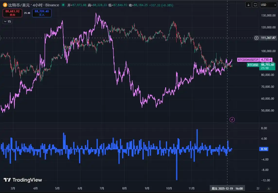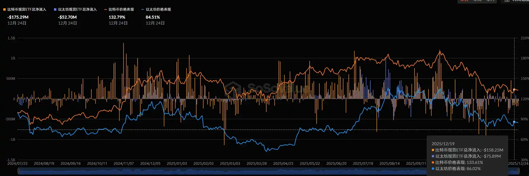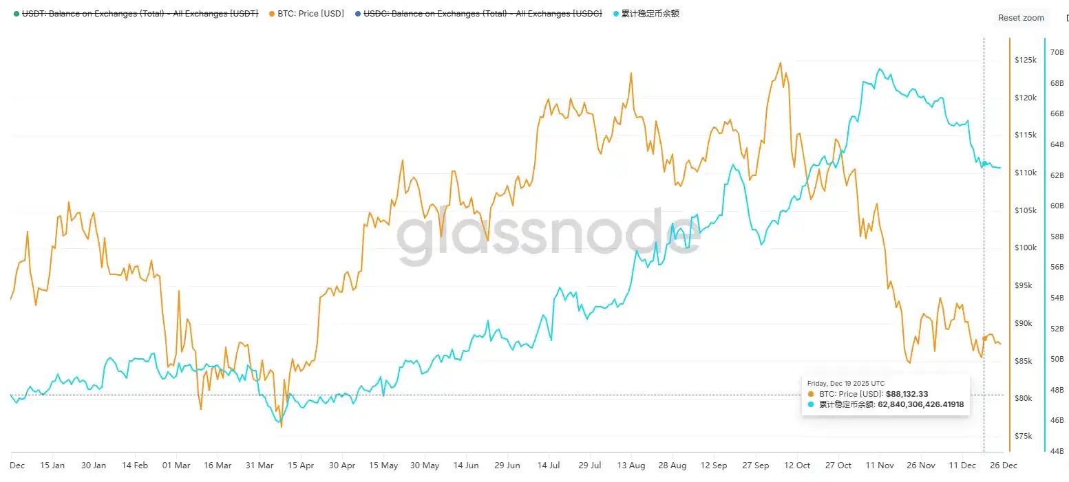 This week (12/20-12/26), the weekly issuance of stablecoins was -$326 million, indicating continued outflow of funds, but the scale of outflow has significantly narrowed. Compared to last week's negative issuance of -$824 million, the average daily negative issuance this week decreased from -$117.7 million to -$46.5 million, representing a 60% increase in overall fund flow. The broader market was mainly volatile this week without sustained declines, which aligns with the trend of reduced stablecoin outflows.