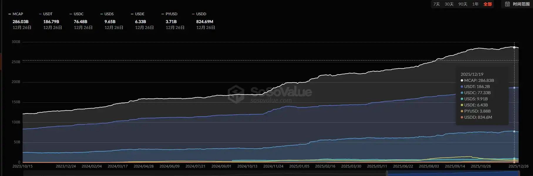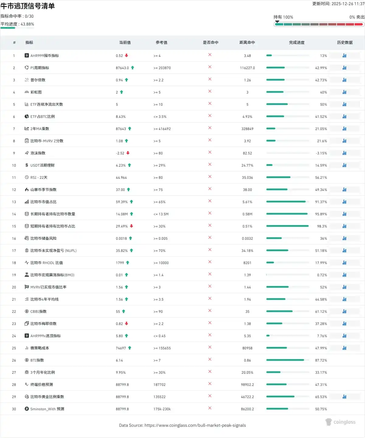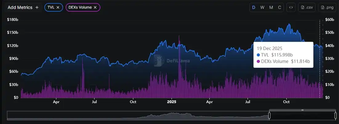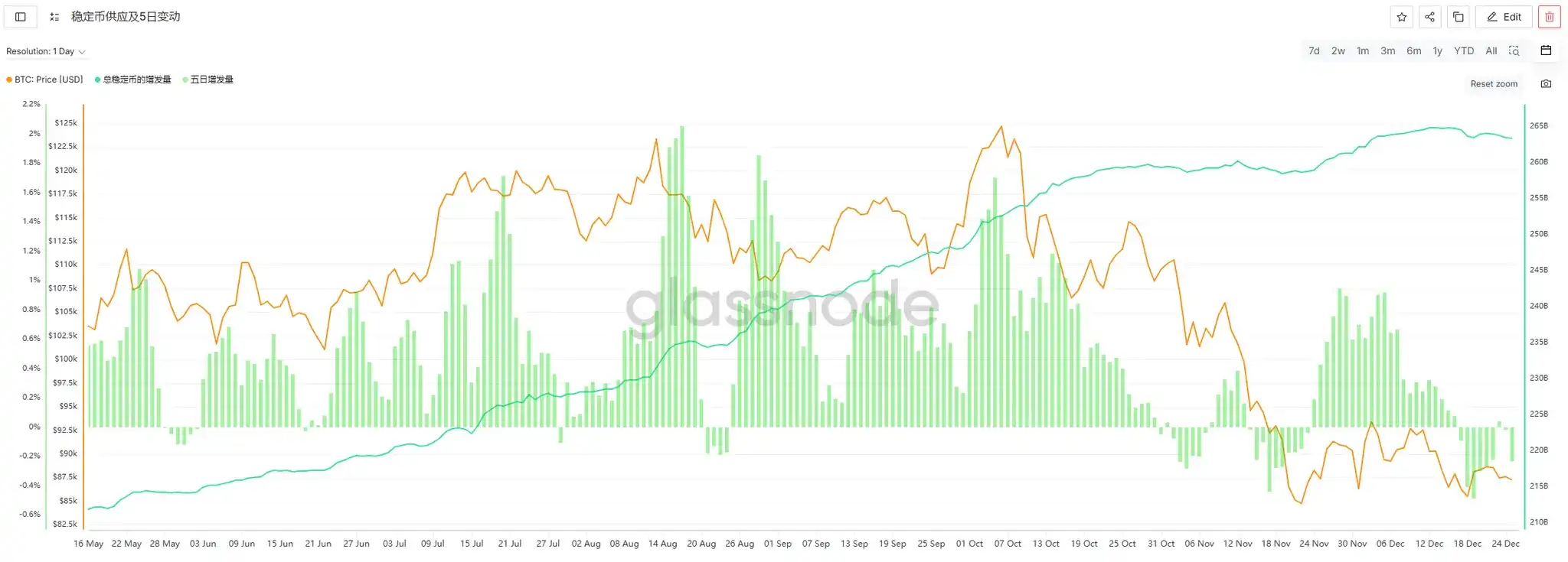 This week (12/20-12/26), the weekly issuance of stablecoins was -$326 million, indicating continued outflow of funds, but the scale of outflow has significantly narrowed. Compared to last week's negative issuance of -$824 million, the average daily negative issuance this week decreased from -$117.7 million to -$46.5 million, representing a 60% increase in overall fund flow. The broader market was mainly volatile this week without sustained declines, which aligns with the trend of reduced stablecoin outflows.