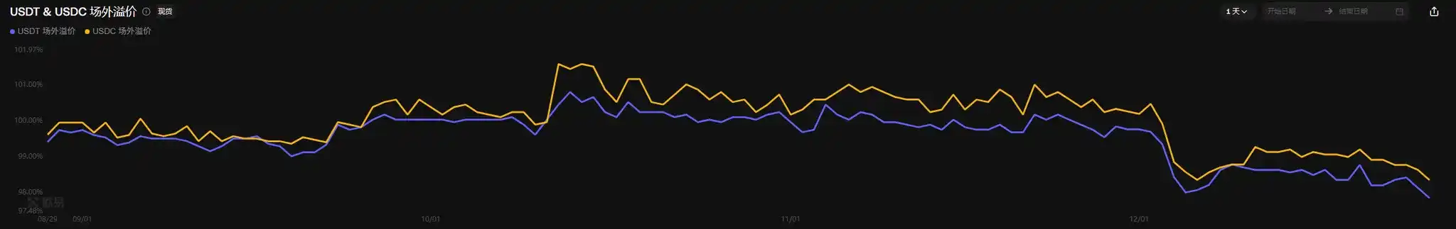 This week, the off-market discount/premium rates for USDT and USDC slightly declined. The current USDT discount/premium is 97.86%, and USDC is 98.36%, both at relatively low levels for the year. This phenomenon reflects continued低迷 market sentiment, insufficient off-market funds for bargain hunting, and some signs of capital outflow.