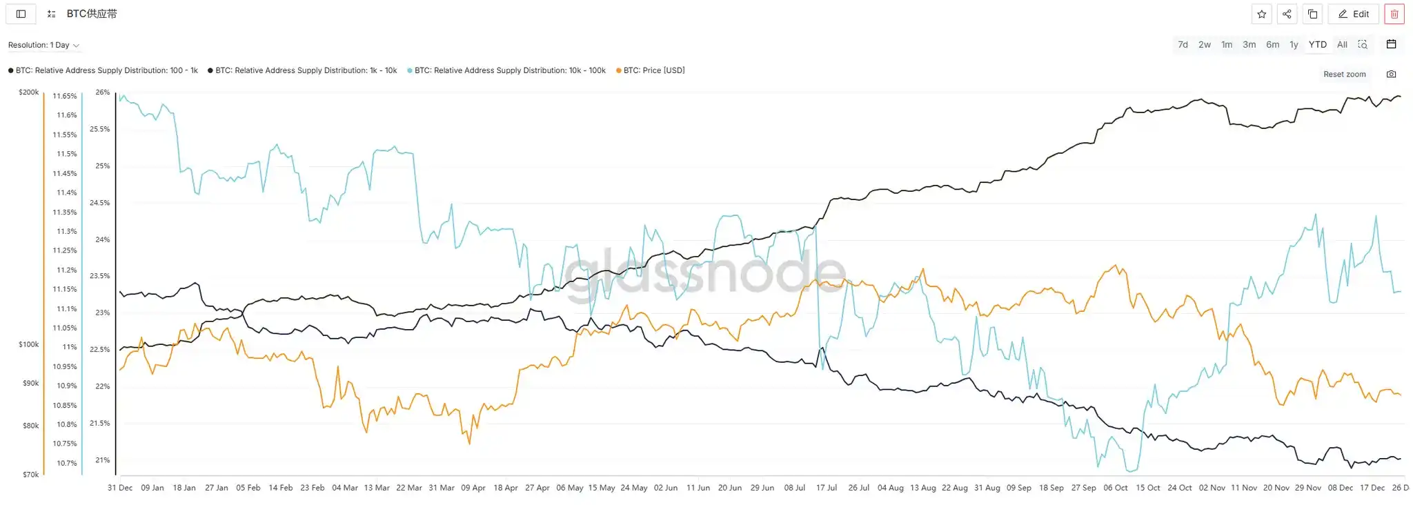 In terms of Bitcoin holding address distribution, the proportion of addresses holding 100-1K BTC increased from 25.813% to 25.951%, showing a slight accumulation trend. The proportion of addresses holding 10K-100K BTC decreased from 11.341% to 11.146%, indicating some reduction. The proportion of addresses holding 1K-10K BTC slightly increased from 20.972% to 21.022%, showing overall minor fluctuations.