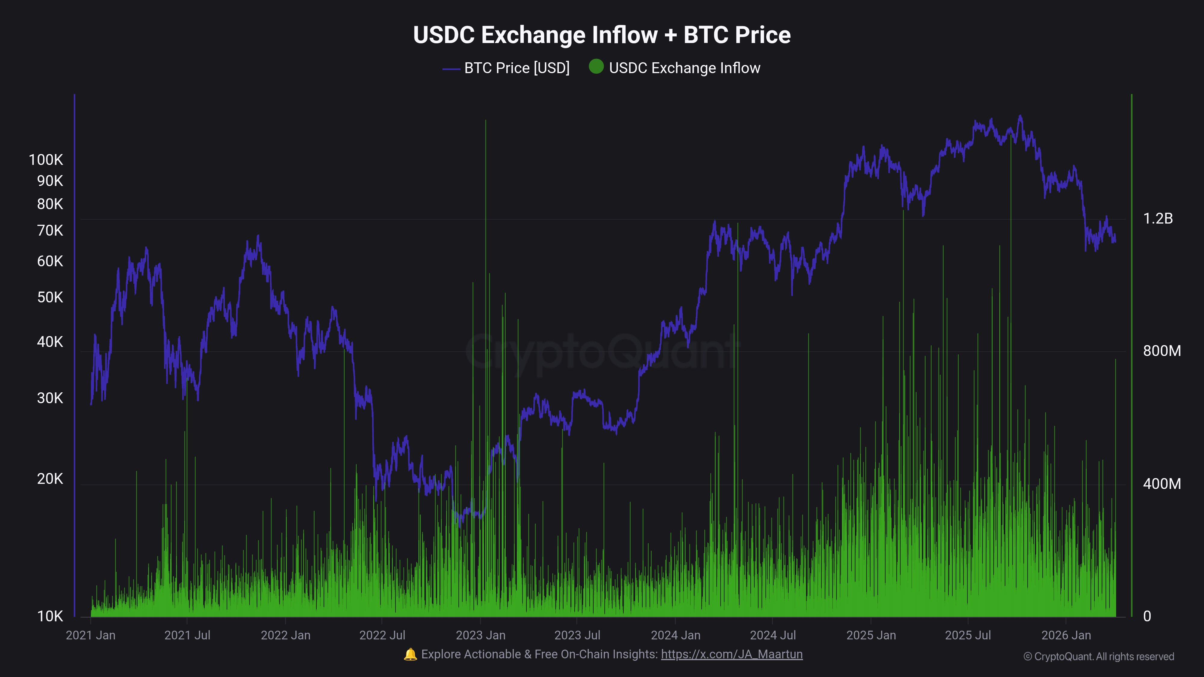 On-chain data shows the Exchange Inflow indicator has shot up for USDC, something that could be relevant for Bitcoin and other digital assets.
