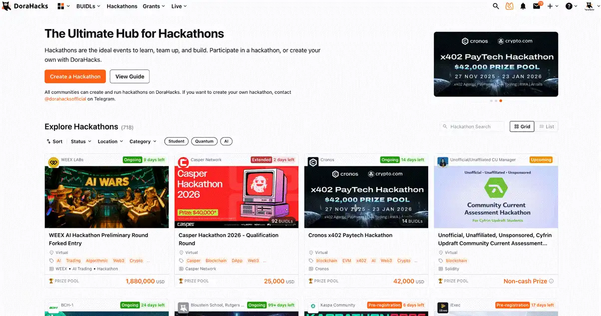 A reliable platform can help filter out the noise. DoraHacks is one of the world's primary hackathon platforms. Thanks to the trust of hackers and the industry, DoraHacks consistently collaborates with leading enterprises and communities to host hackathons in various tech fields like AI and blockchain. The platform's reputation means both organizers and participants have a basic quality guarantee. Furthermore, the platform archives hundreds of thousands of past projects; you can research before competing and learn from previous winners (more on that later).
