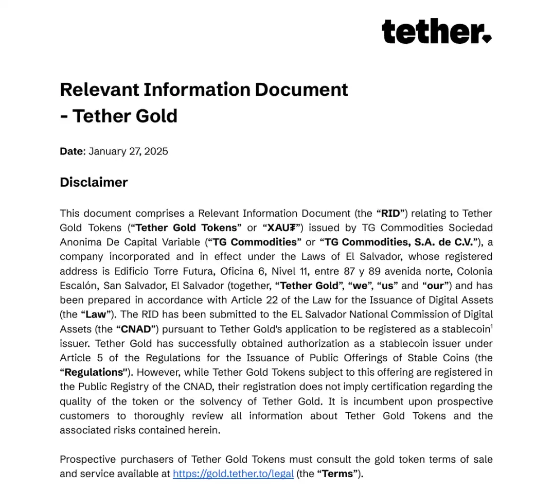 Selon la dernière version du livre blanc publiée le 27 janvier 2025, « Relevant Information Document – Tether Gold (XAU₮) », Tether Gold (XAUt) est un stablecoin adossé à l'or émis par la société salvadorienne TG Commodities, S.A. de C.V.