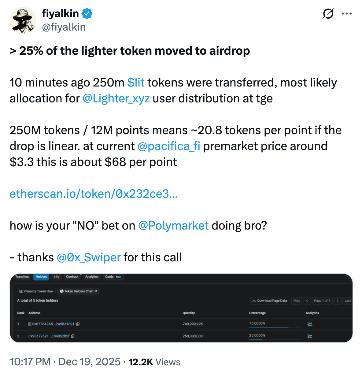 Onchain analyst Andrew 10 GWEI previously suggested that the airdrop would happen by the end of December, using an alleged insider bet proof on Polymarket.