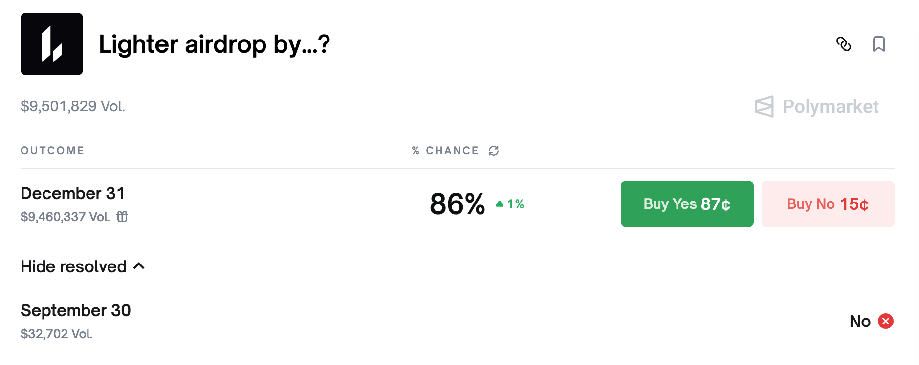 Amid rising community anticipation, the odds that Lighter’s airdrop will occur before the end of the year have been climbing on the prediction market Polymarket, with $9.5 million in volume backing bets that it will take place by Dec. 31.