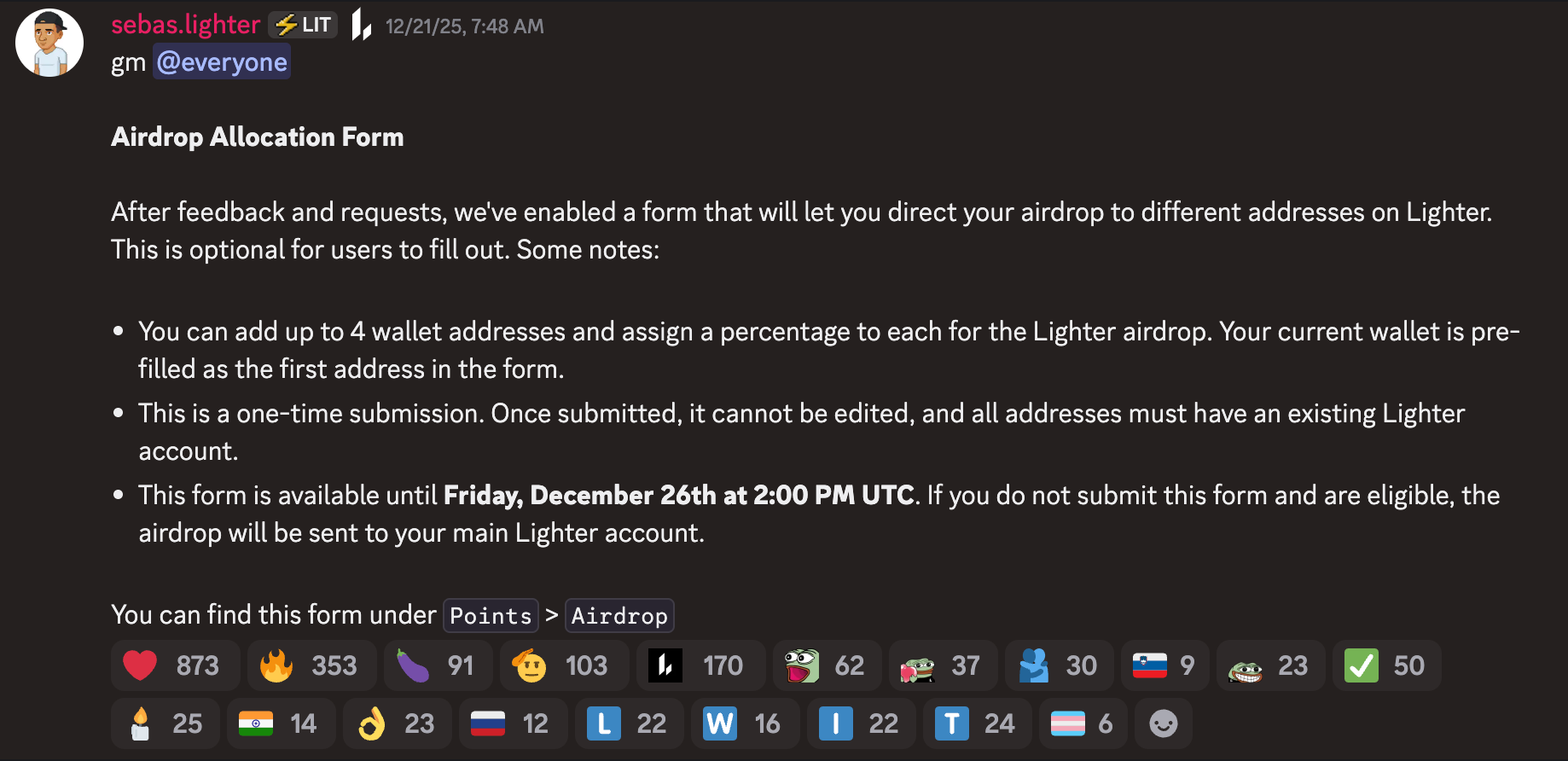 “If you do not submit this form and are eligible, the airdrop will be sent to your main Lighter account,” Sebas said on Discord.