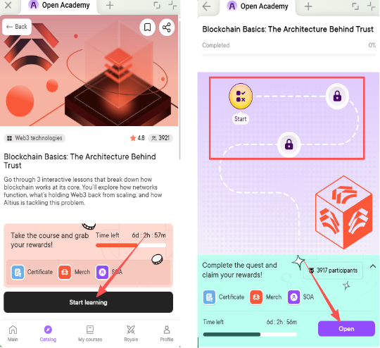 STEP 2. After entering the TG mini-app, click "Start learning". Complete the 3-level course tasks as prompted, then click "Open" below and complete the social tasks in order.