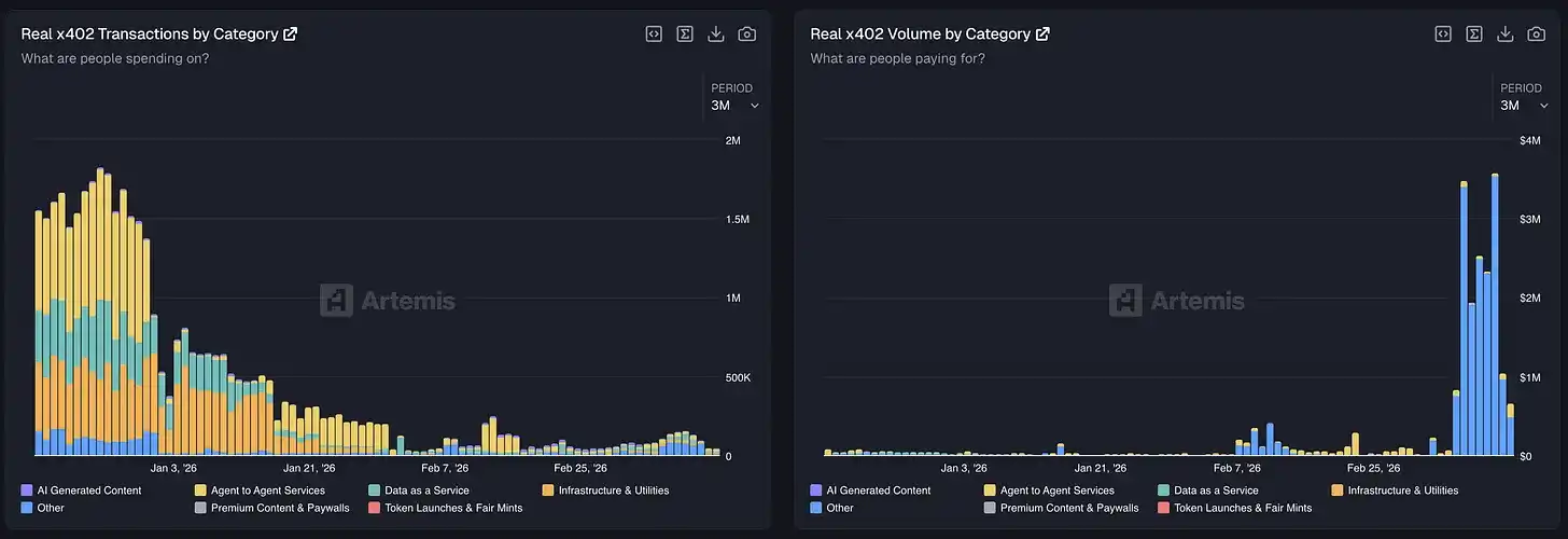 a16z partner Noah Levine pointed out that "real" transaction volume is significantly lower than the inflated numbers caused by fake activity earlier this year. Bloomberg reported x402's 30-day payment volume at $24 million (data from x402.org); Allium Labs' data was around $3 million; Artemis, filtering out wash trading, estimated real volume at about $1.6 million.