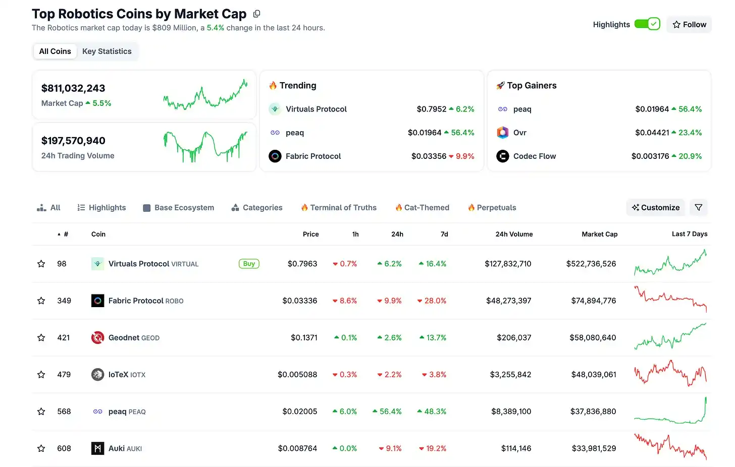 ROBO (7-day -28%): $0.03336, market cap $74.9 million. Fabric Protocol (OpenMind/Fabric Foundation) is finding price equilibrium after initial listing enthusiasm. Still a relatively new player in the robotics category.
