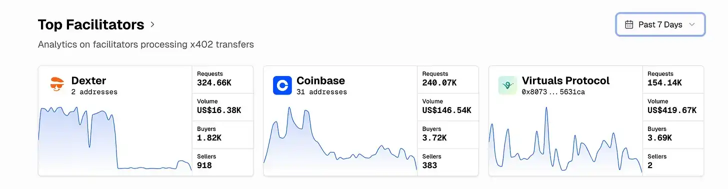 The facilitator ranking is diversifying: high-frequency micro-payments (Dexter), institutional API access (Coinbase), structured Agent commerce (Virtuals/ACP).