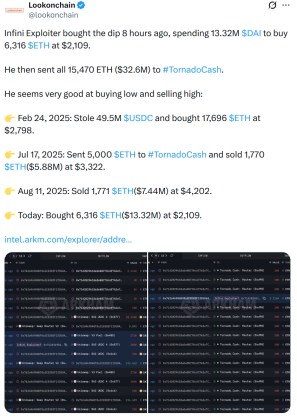 The ghost of a past exploit has returned to the blockchain. On-chain data confirms that the wallet associated with the notorious Infini exploit has broken its silence, moving significant capital to accumulate Ethereum during the recent market dip.