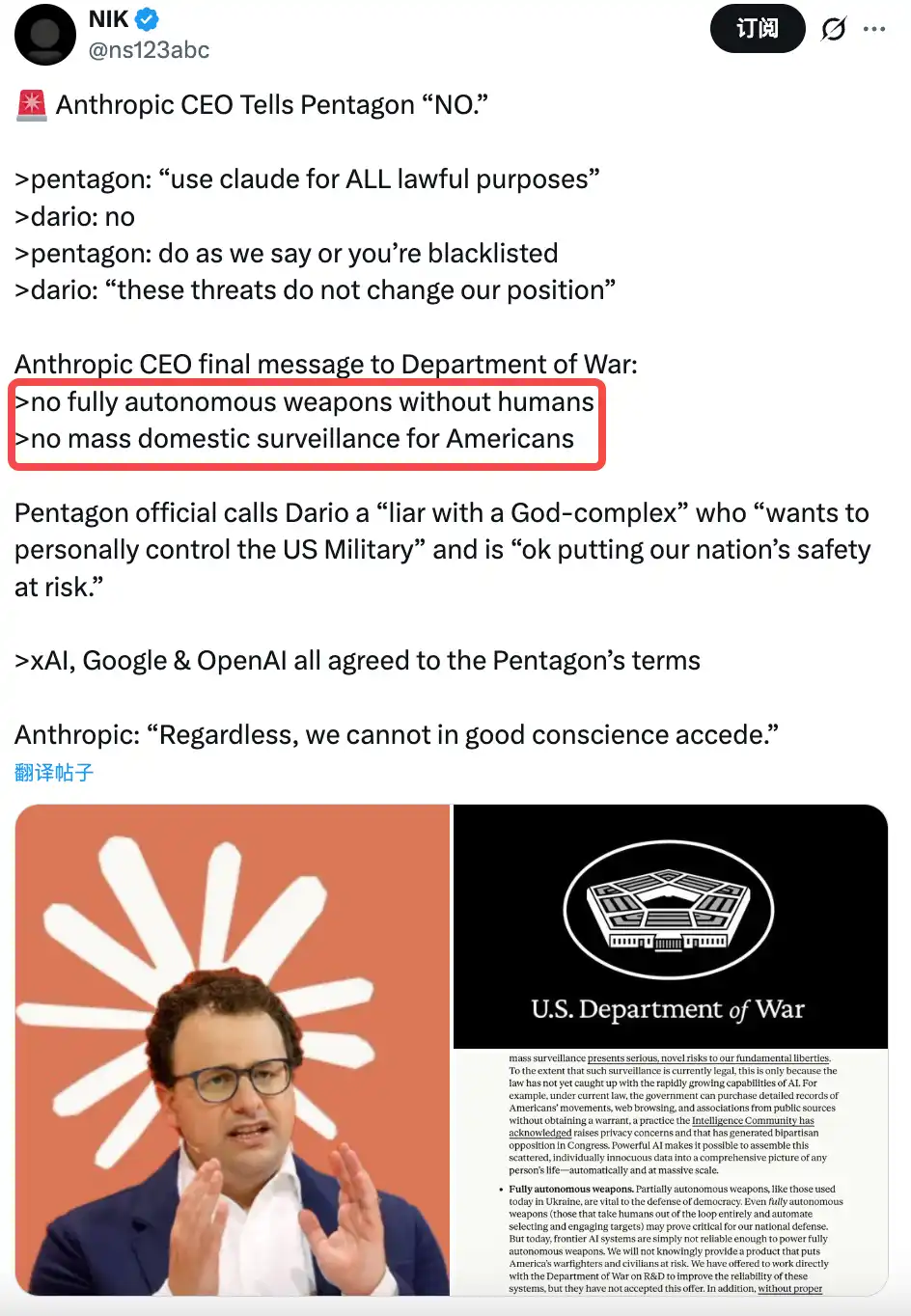 Les mêmes principes, les mêmes lignes rouges, Anthropic, parce qu'elle a demandé une garantie supplémentaire, s'est placée du mauvais côté, a adopté la mauvaise posture, a été marquée comme une prétendue menace pour la sécurité nationale américaine au même niveau que Huawei.