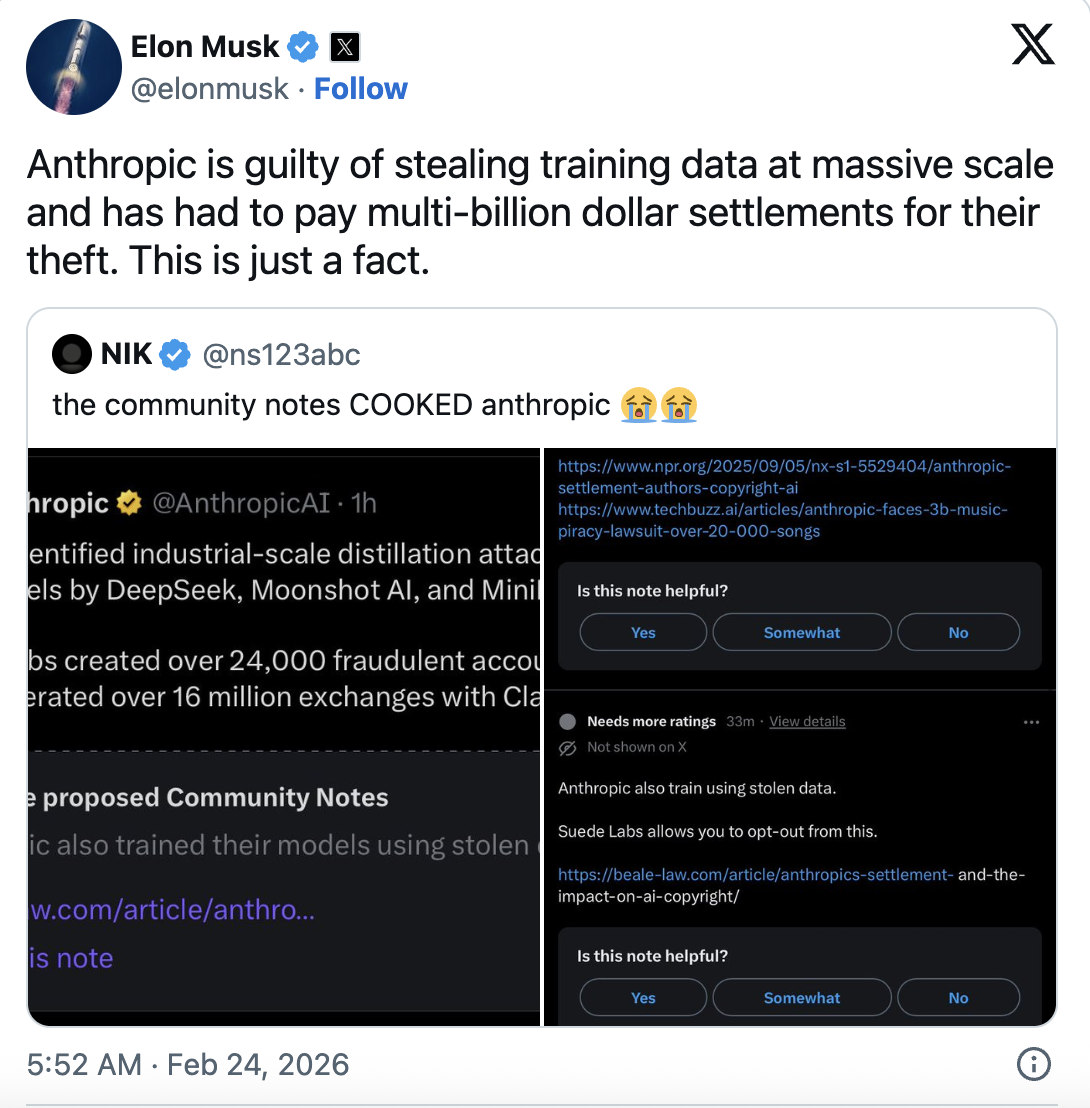 也是同一天,Elon Musk 在 X 上发帖说:“Anthropic 大规模窃取训练数据,这是事实。”同时,X 的社区笔记补充了 Anthropic 因使用盗版书籍训练 Claude 而支付 15 亿美元和解金的报道。