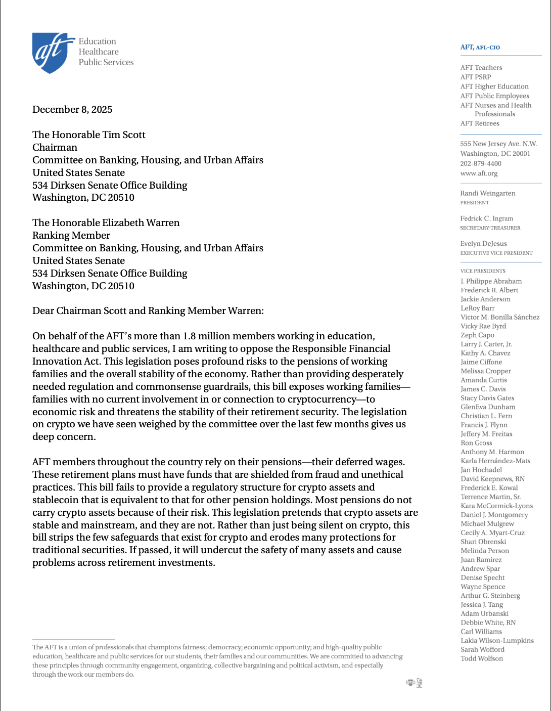 In October, the American Federation of Labor and Congress of Industrial Organizations (AFL-CIO) also wrote to Congress opposing provisions within the crypto market structure regulatory bill.