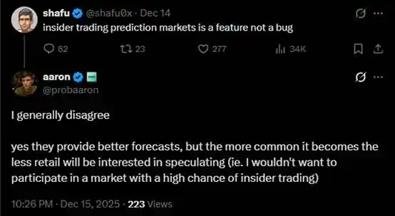 This view has some merit, but I think prediction market platforms themselves would resist such positioning because, in the long run, it would harm retail trust. The entire market would essentially change from a platform encouraging individual research and insight, aggregating collective wisdom, into a one-sided 'slaughter' by insiders, which is not conducive to the development of liquidity. If prediction markets were like this, it would be better to rename them 'information bounty platforms.'