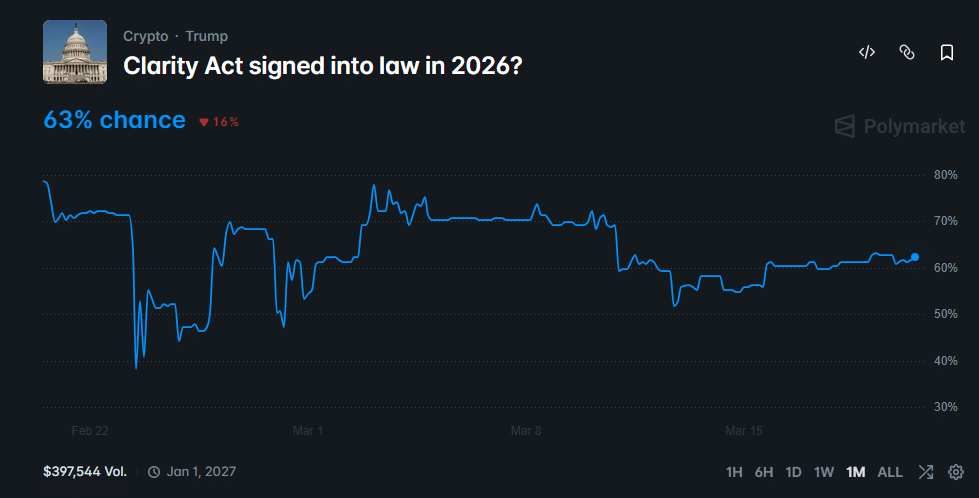 In early March, the chance of the CLARITY Act becoming law dropped to nearly 50% as the White House and the banking industry hit a snag over stablecoin yields.