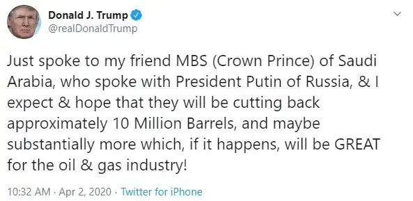 Subsequently, he posted a tweet hinting that a production cut agreement was imminent. That day, WTI crude surged 25%, marking the largest single-day gain in history.