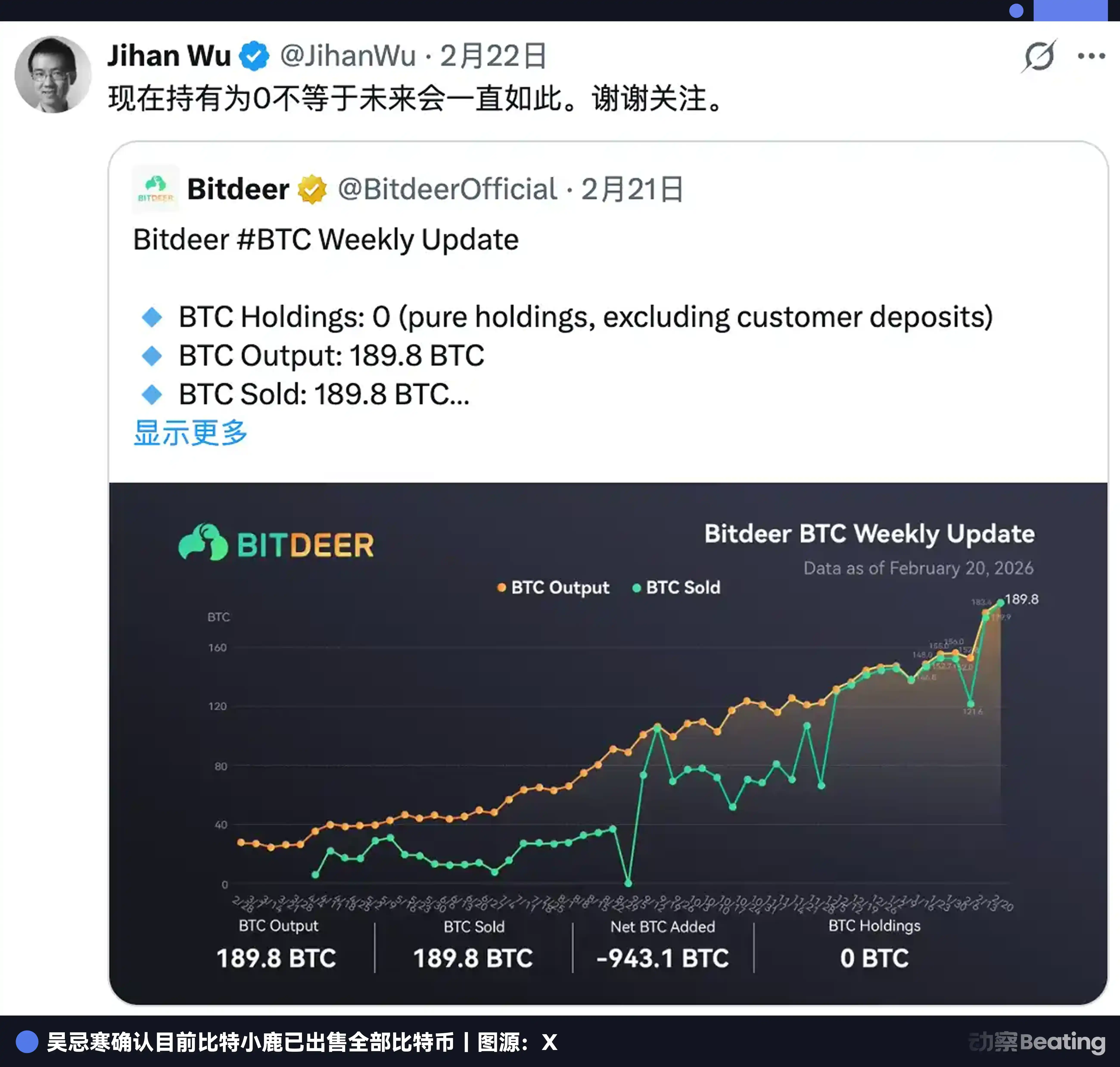 El 20 de febrero de 2026, Bitdeer publicó en X su actualización de producción semanal: esa semana extrajeron 189.8 BTC por sí mismos y los vendieron. El inventario restante de 943.1 BTC se vendió de una vez.
