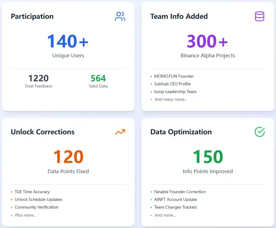 Additionally, we corrected about 120 token unlock information points. Some had inaccurate TGE times, while some had unlock rules not disclosed promptly; these issues were all optimized through the community's efforts.
