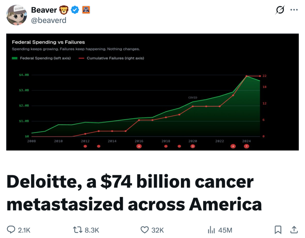 The creator who became a millionaire with a single article goes by the X username Beaver. His article, "Deloitte, a $74 Billion Cancer Metastasized Across America," garnered 45 million views.