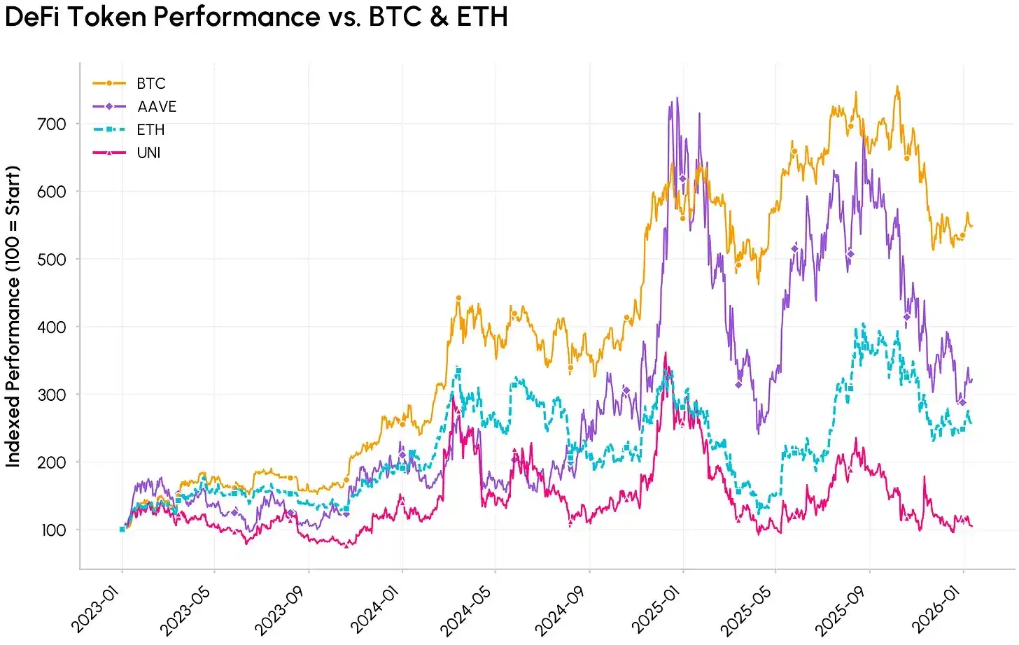 Indexed performance comparison of DeFi tokens (AAVE, UNI) vs. mainstream cryptocurrencies (BTC, ETH)