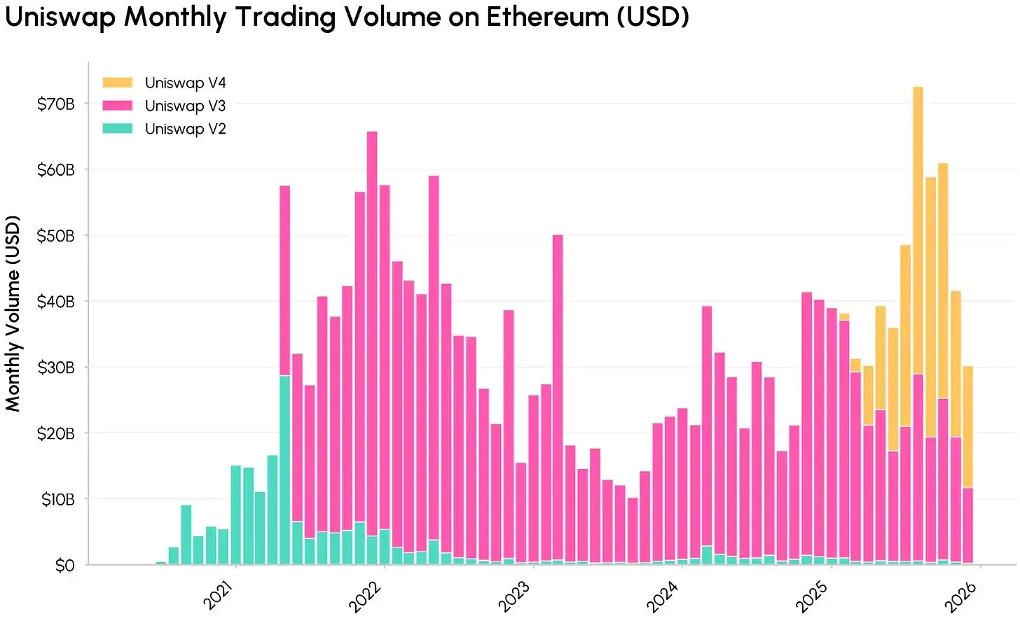 Monthly trading volume (in USD) trends of various Uniswap versions (V2, V3, V4) on the Ethereum network. Source: Coin Metrics Network Data Pro