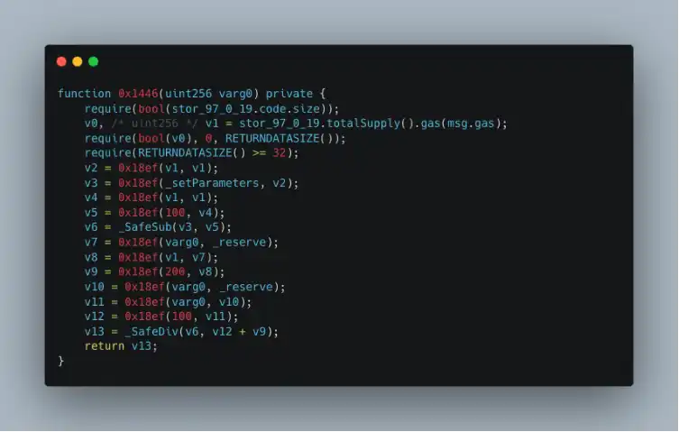 通过比较两个函数的共同点,我们可以发现 0x1446 函数的用于获取购买指定数量的 TRU 需要多少 ETH。显然 0x1446 函数逻辑存在问题,导致 ETH 计算错误。下面详细分析 0x1446 函数中的逻辑。
