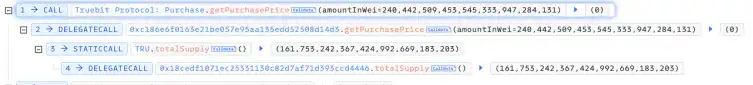 1. 攻击者先调用 getPurchasePrice(240442509453545333947284131) 函数,返回 0。