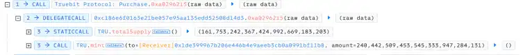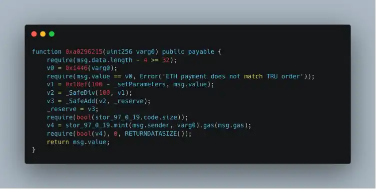 2. 攻击者调用 0xa0296215(c6e3ae8e2cbab1298abaa3) 函数,同时 msg.value 为 0。最后成功铸造 240442509453545333947284131 枚 TRU。